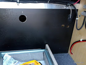 I'd hoped to be able to vent directly out, but the battery box height was such that the vent would hit the aluminum angle that forms part of the storage bay. I drilled a 2" hole through the back of the bay as well as 7/8" holes for the battery cables.